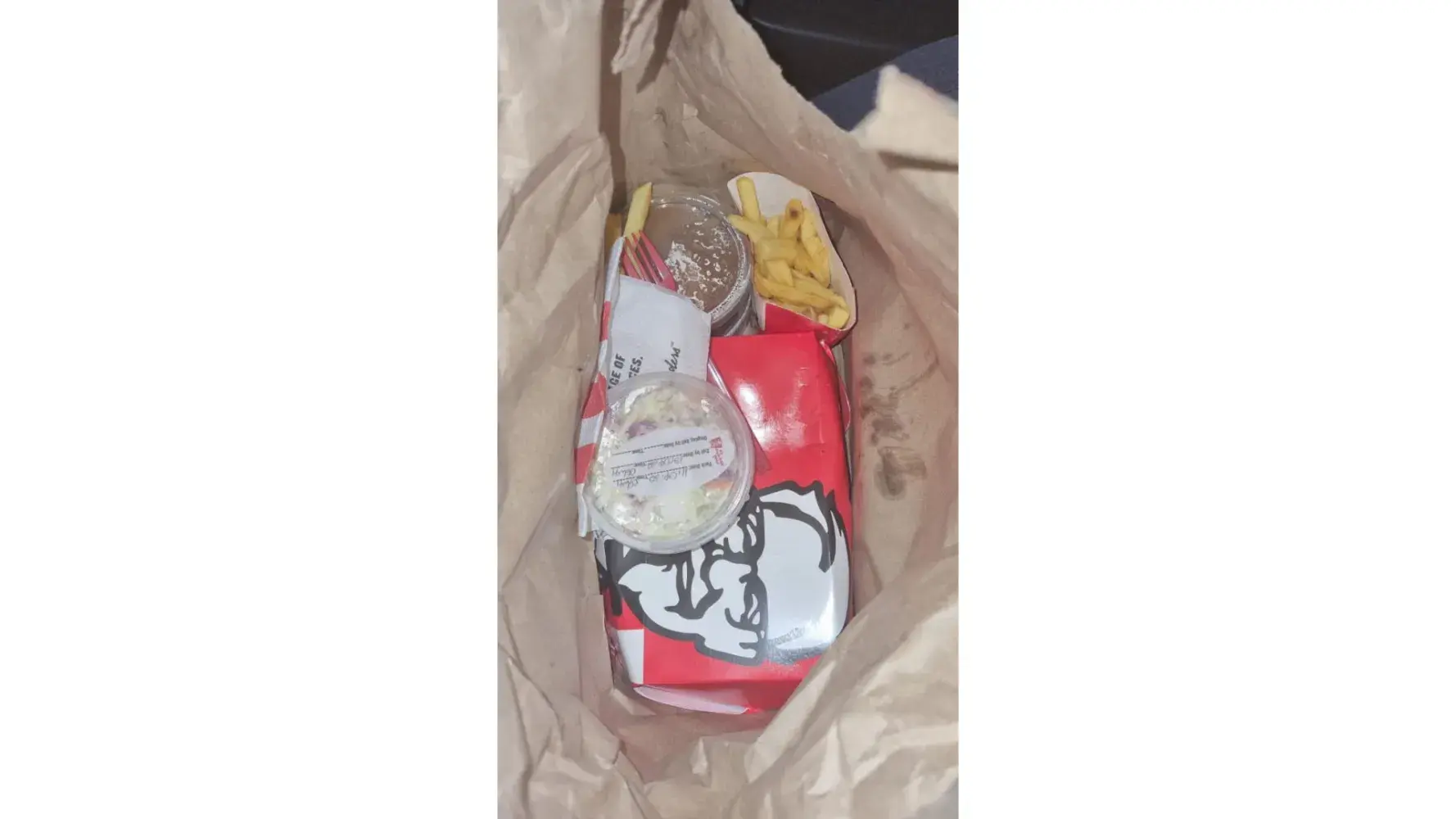 This also happened 2 months earlier, the same meal and the same results but we thought we would give the take out another try. As much as we enjoy the taste of the food from KFC it may be doubtful that we will return to the establishment.