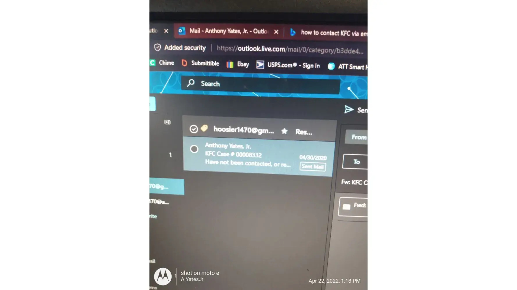 KFC Case # [protected] Greetings, Upon doing a little spring cleaning, I found that this was still in my folder, unresolved. Imagine my surprise! I have found that three years seems to be a good number for bringing my ongoing issues to a close (Thats how long it took another national chain to find a solution to another issue that I had years ago! Attached...