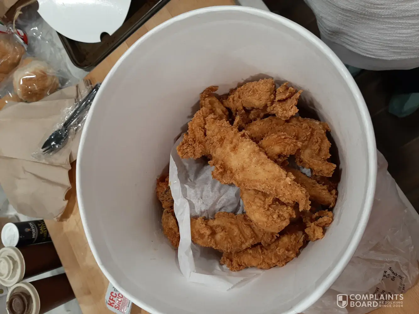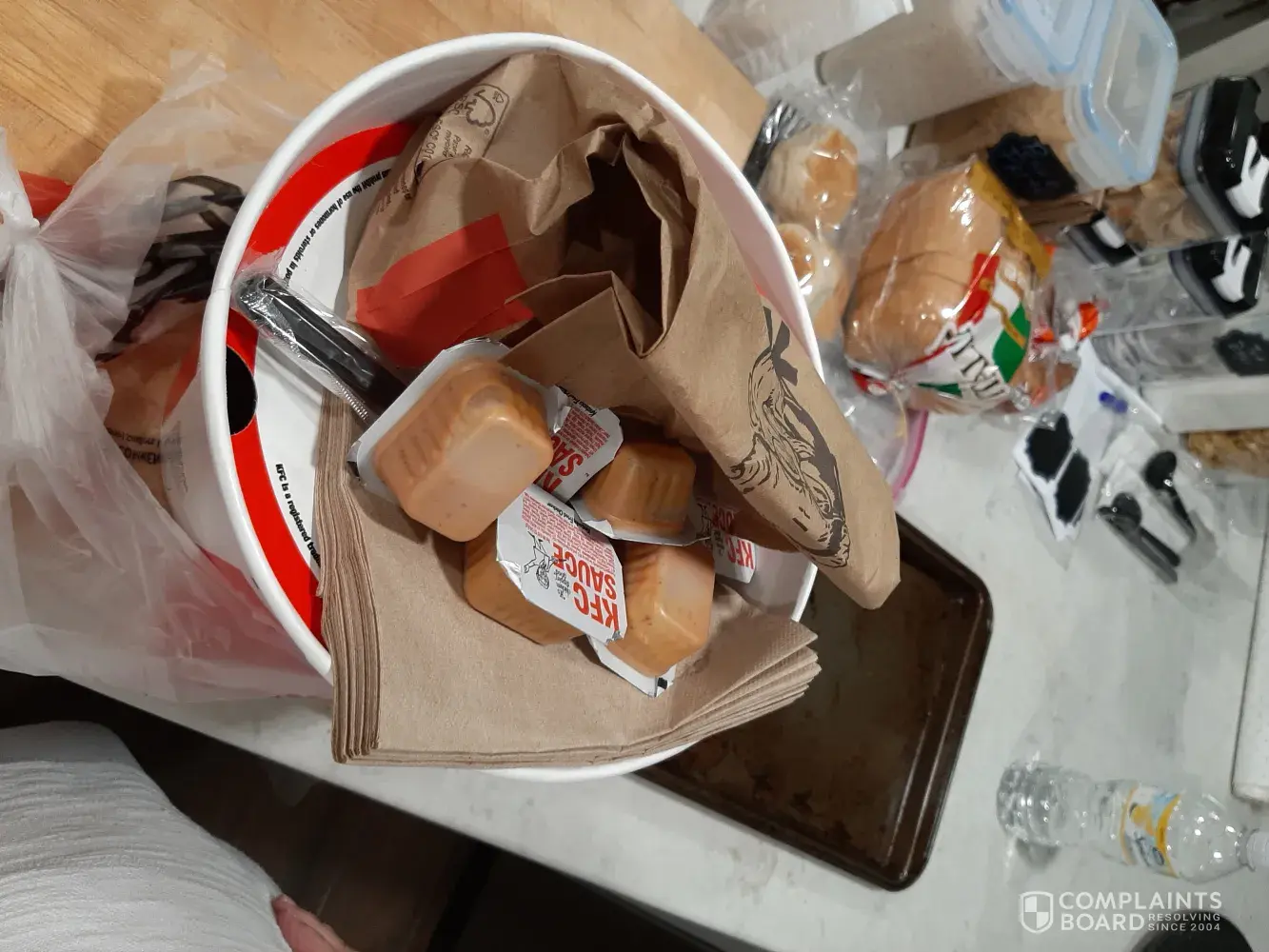 1. The first issue was we ordered (2) two buckets of chicken, but our ENTIRE order was stuffed into (1) one bucket. Which means everything to include the (2) Two full bucket orders of chicken and corn, forks, napkins, and sauces were all in one bucket.