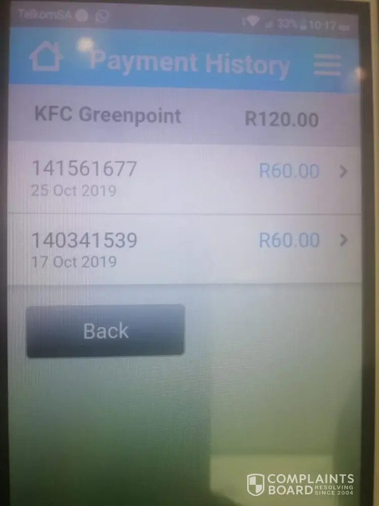 She said the branch was emailed and the matter would be sorted out but still nothing. We then went over to the KCF in Greenpoint as it is across the road from us, after giving proof the payment went through with a ref no [protected] they totally refused to give us our food the money was not even asked for. I then called and spoke to the team leader at the call centre that promised me everything would be sorted out. Well nothing was again walked over to the KFC and again was told sorry your proof is not enough and we can't give you your food. It was now 4 in the afternoon still I had not eaten and I had to leave also no call from the team leader.