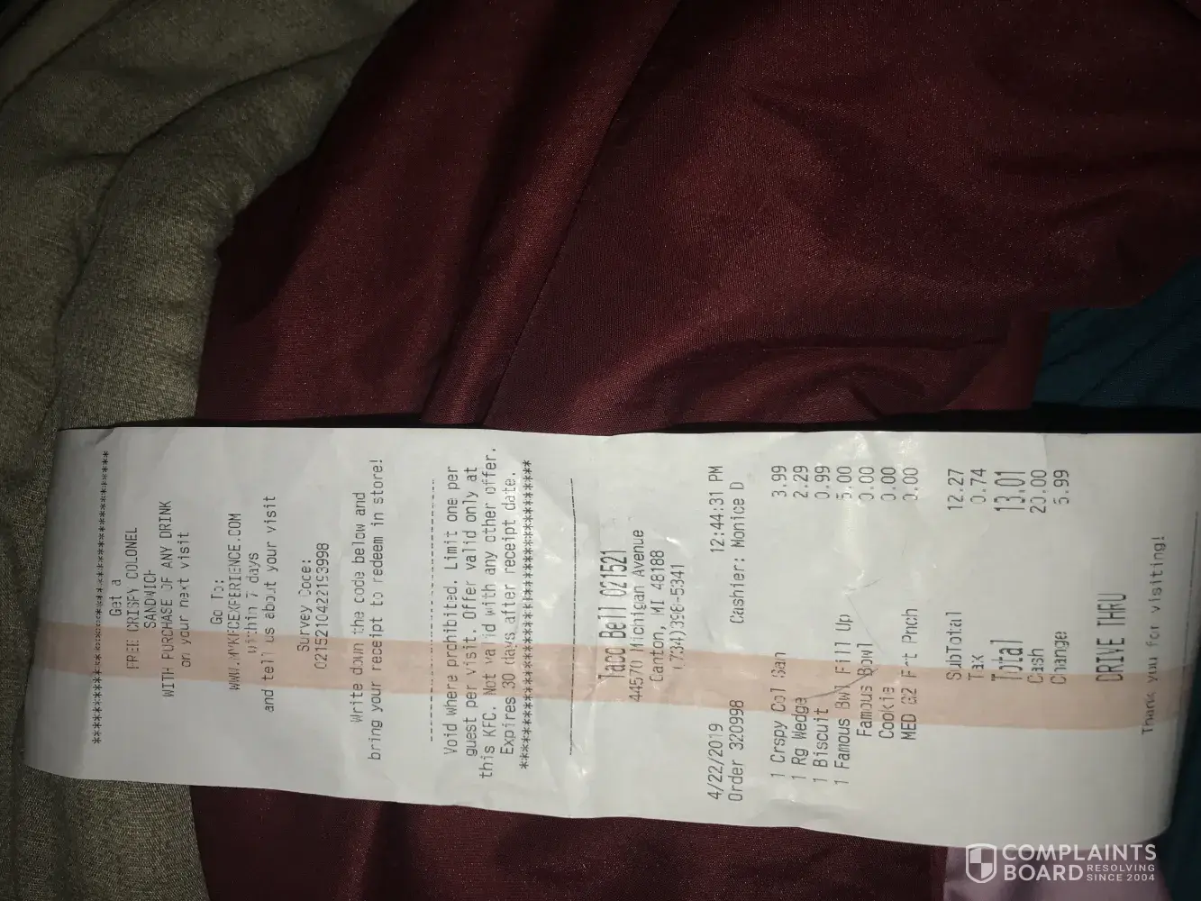 The first 2x's I went into the resturant, OMG that was a nightmare rude staff. I ordered off of the KFC side of the menu, the third time I did drive thru, and ordered TB, I ordered at 1:54 pm and took 20 min to receive it, with only 2 cars ahead of me.
