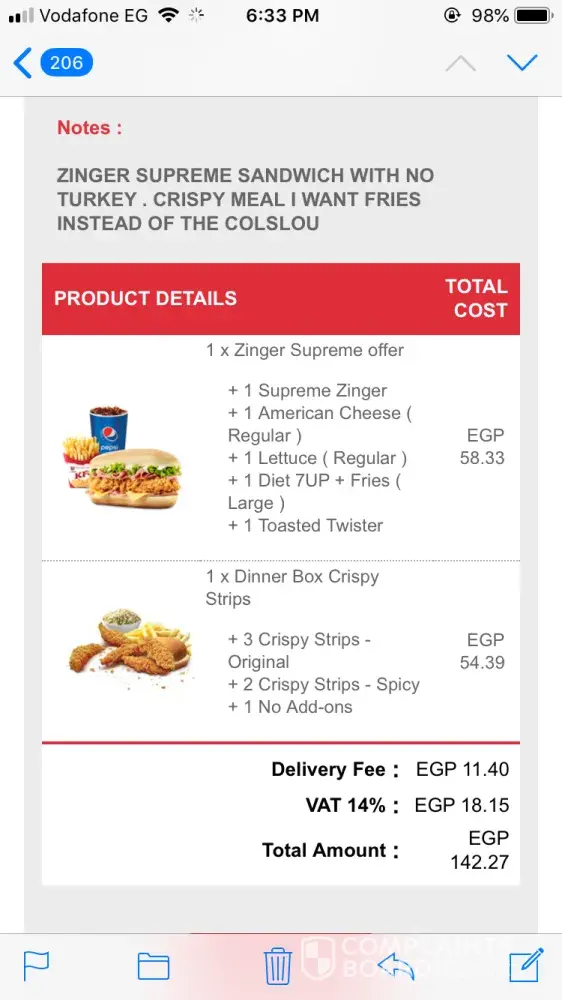 I ordered online via kfc egypt crispy strips 5 pcs meal "2pc spicy + 3pcs original" with a remark that i want to change the colslo with french fries, also i ordered zinger supreme with a remark "without turkey" .. Actually i received the meal with 5pc strips spicy and a colslo ! And the sandwich with turkey ! And when i contacted the branch manager ; he was extremely rude and told me that i might had forget to write the remarks and the receipt doesnt show any remarks! I told him that all of my remarks are written in the order confirmation email that i had received from the website ! He told me literally : this is non of my business! Really kfc egypt are extremely rude and unprofessional at all and this is not the first or even the second time to experience this with them ! They know nothing about professionality or customer handling !