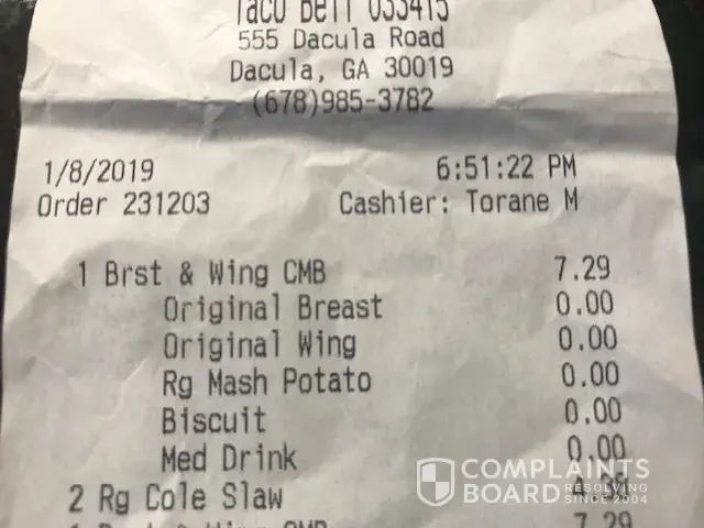 On January 18th, my husband and I placed an order -i ordered the barbque 2pieces leg/thigh, potato wedges, and Cole slaw. Hubby ordered the original chicken legs, 1 Cole slaw and 1mac and cheese. My dinner was leaking on the other boxes. We did not get the wedges, but we had 2 extra Cole slaws, 2 extra Mac and cheese. I do not like Mac and cheese at all. My chicken was horrible! I've never had a meal so awful. We also attempted to use a coupon we got from GrubHub for $12.00 off. Well that didn't work. It was good till 1/31/19.. used the chat to get help with the incorrect charge. I was told it would be taken care of. Not confident in that answer. I'd like a 100% refund . I don't hold grudges so I'd come back at some point. Just need this matter fixed