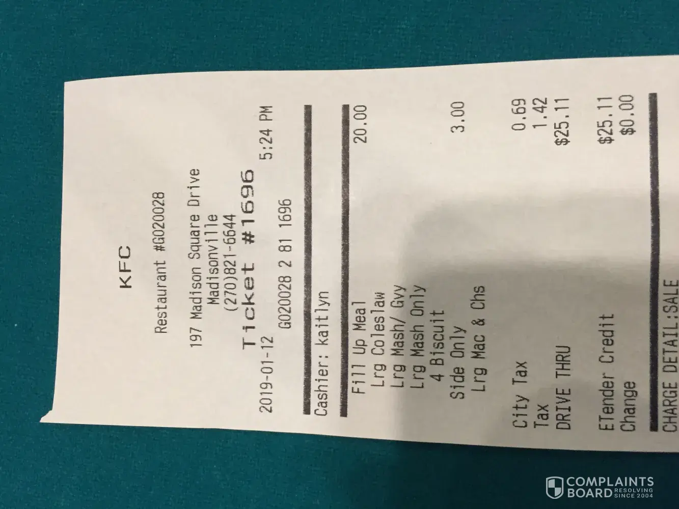 I visited the local kfc tonight and my total before tax was 23.00 dollars with city tax of 3% and state of 6% the total should have been 25.07 but I was charged 25.11. After some figuring they added the 3 % to the 23.00 which is 23.69 and then charged 6 % of that adding tax on tax. Would you look into this and have someone set there registers right