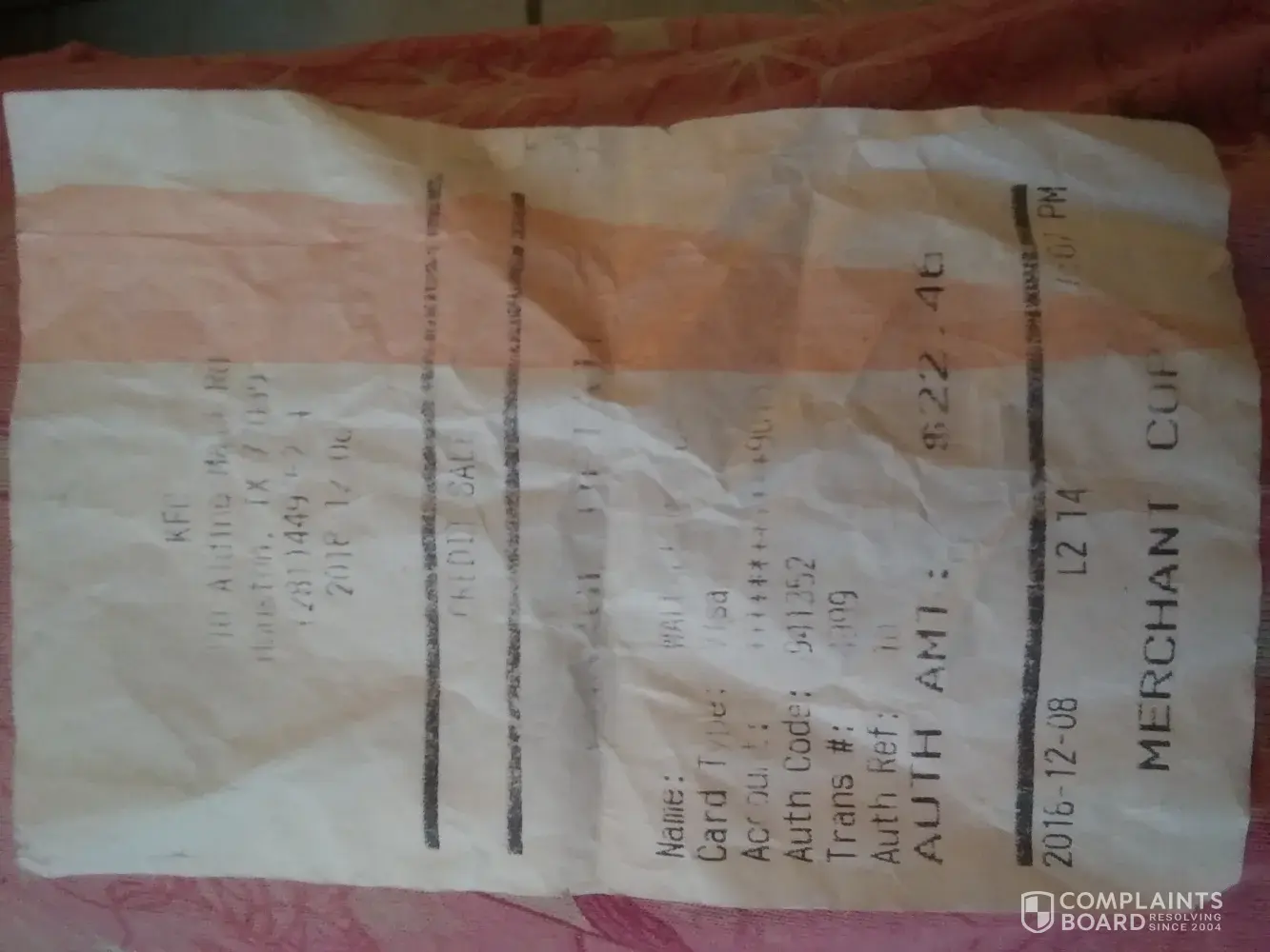 My husband called into ellenbrook kfc, he went through drive through.. He had ordered a dinner for two and when he came home we did not receive any of that.. What we did get was 2 large chips that were really cold and very old (not fresh at all) we got chicken nuggets and few pieces of disgusting chicken.. We didn't even eat the chicken, looked old and not fresh.. Was really pissed 😡 off as this was our tea instead we threw this out incase of food poisoning..