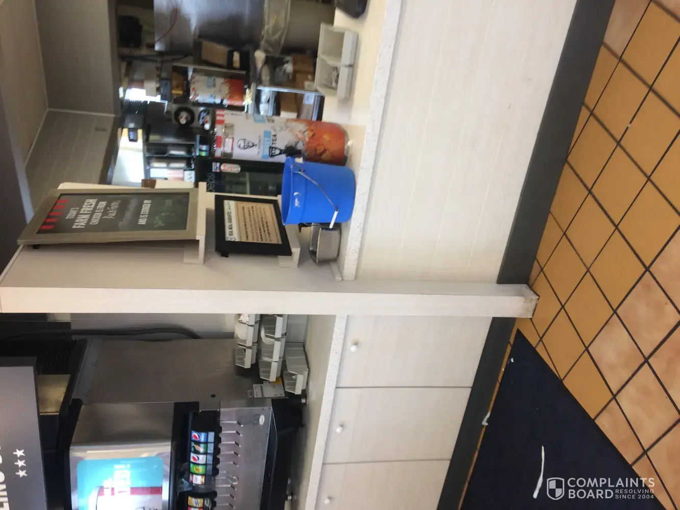 Bucket of dirty sanitizer water on counter near condiments - blocking salt and pepper packets — no napkins- told customers no slaw - short on cooked chicken ( frozen) — Mgr young blonde girl was rude and did not attend to outages of napkins, etc — just stood around talking - then cashed out cashier and she and cashier left - leaving a cook, drive thru guy, and cashier — I guess she just did not care about customer service —5:23 was visit time, 07/02, Tran # 4836
