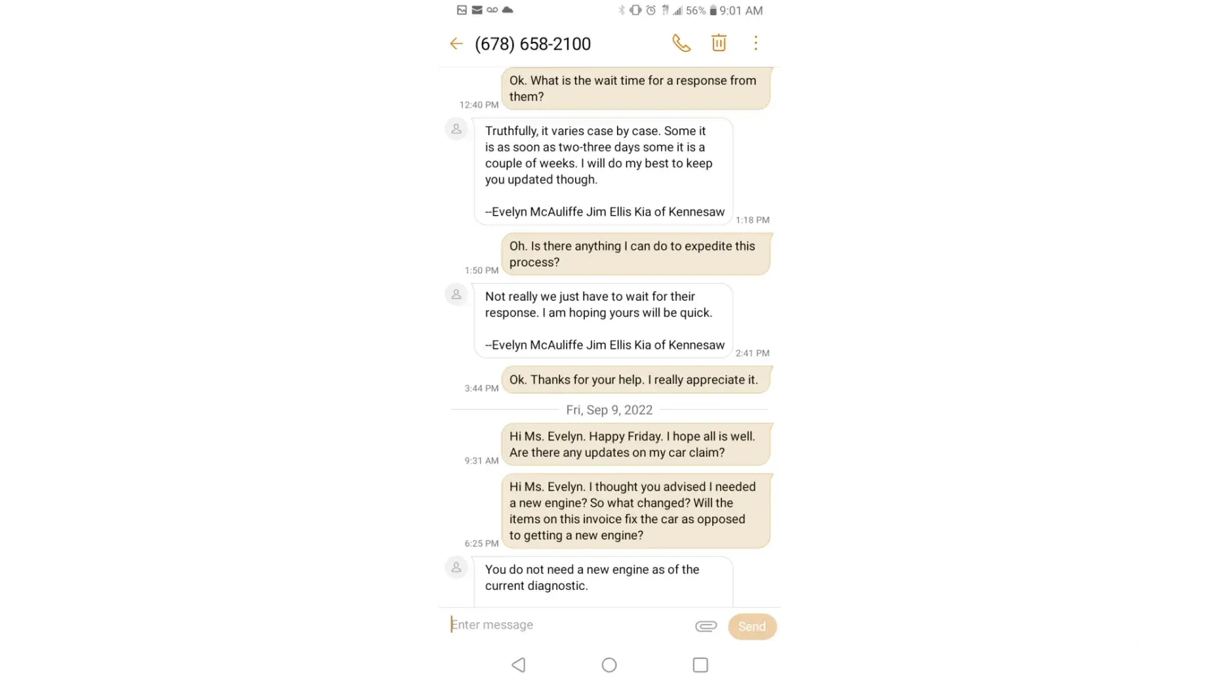 Called Kia because my car stopped accelerating over 40mph, was told that would start a claim for me a new engine, then advised they would not, charged over $1200 for repairs, and have had even more issues since today car is doing the same thing less than 5 months later and I may have to be swindled out of more money! Please help! My car note is due 2/18/23 and I cannot afford to pay it. I am out of work at this time and now a car.
