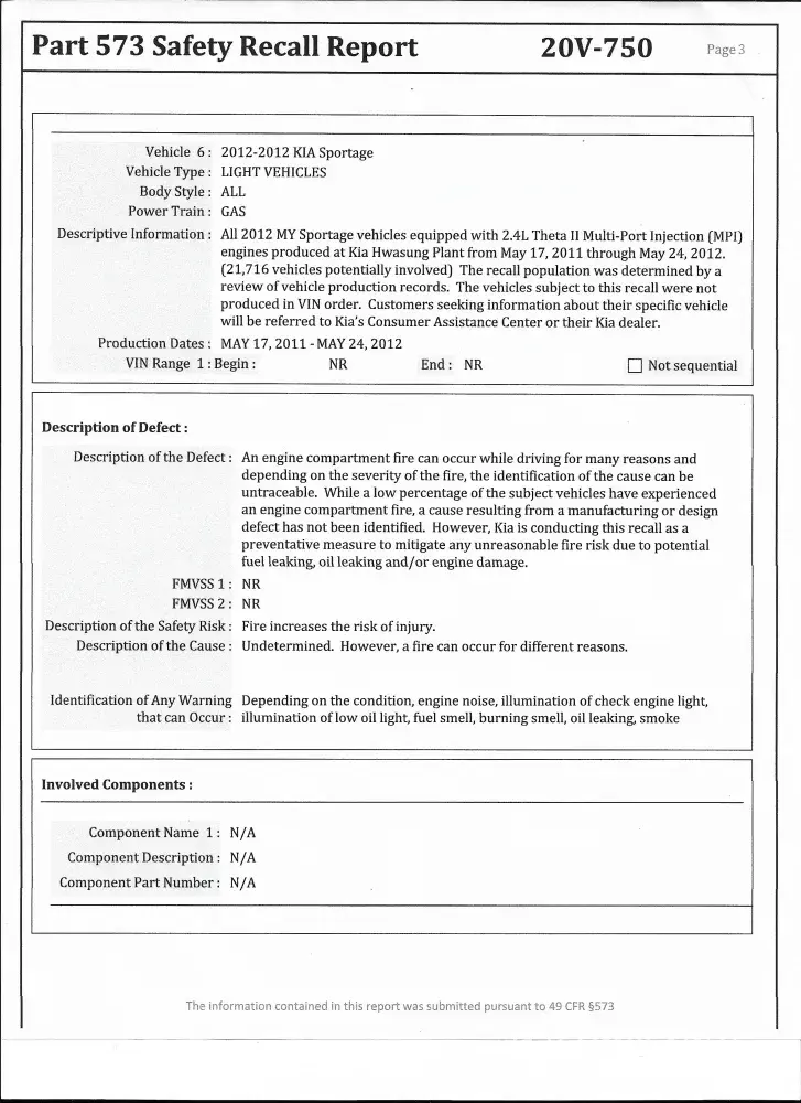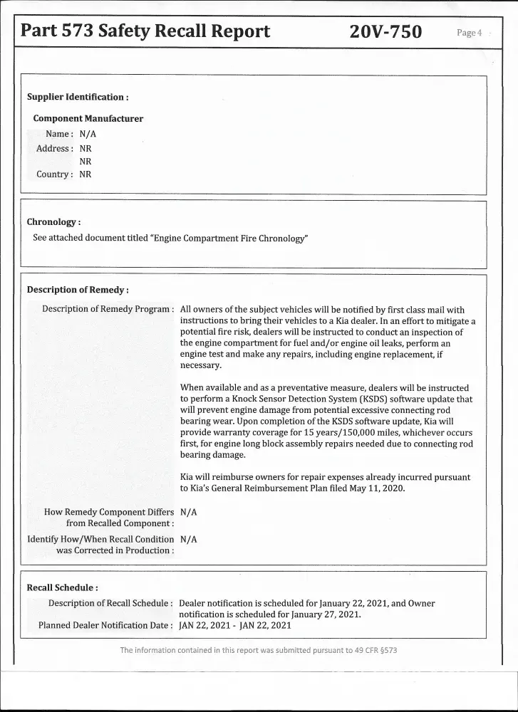 I believe Kia should stand by the quality of their vehicles and vehicle parts--especially an engine up to 100, 000 miles. See 4 pages of similar engine recalls and recent evaluation from Kia dealership.