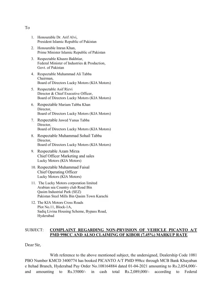With reference to the above mentioned subject, the undersigned, Dealership Code 1081 PBO Number KMCD 3400774 has booked PICANTO A/T PMD 998cc through MCB Bank Khayaban e Itehad Branch, Hyderabad Pay Order No.[protected] dated 01-04-2021 amounting to Rs.2, 054, 000/- and amounting to Rs.35000/- in cash total Rs.2, 089, 000/- according to Federal Government (Industries and Production) policy for Automobile companies that if a customer booked a vehicle then company have to make sure the delivery of vehicle under 60 days if the period exceed from 60 days company have to pay KIBOR (7.45%) markup to the consumer.