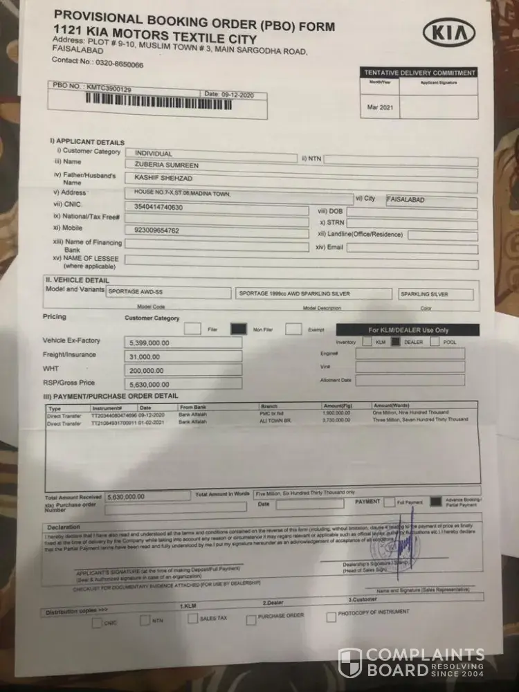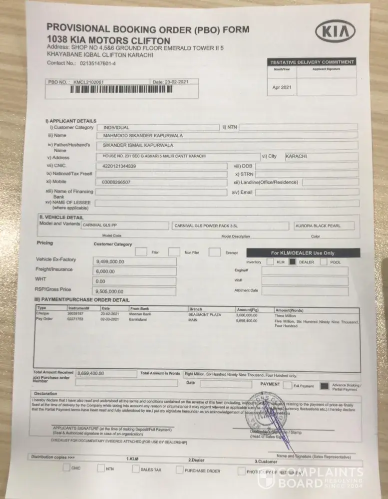 I am existing customer of Kia Sportage and very impressed with the commitment and service of Kia motor but this incident completely changed my perception about kia motors and it seems that they are following the footsteps of previous manufactures with no focus on genuine buyers rather allowing dealers to sell cars on extra money to investors while delaying deliveries of actual buyers. I checked with another dealer in Karachi they are selling Kia carnival on extra money of PKR 2 lakhs which means there's no delay in delivery of car. I expect Kia motor will take appropriate action and ensure delivery of car within April as committed, looking forward for a positive response which will show how much kia motor is concern about the customer experience and satisfaction