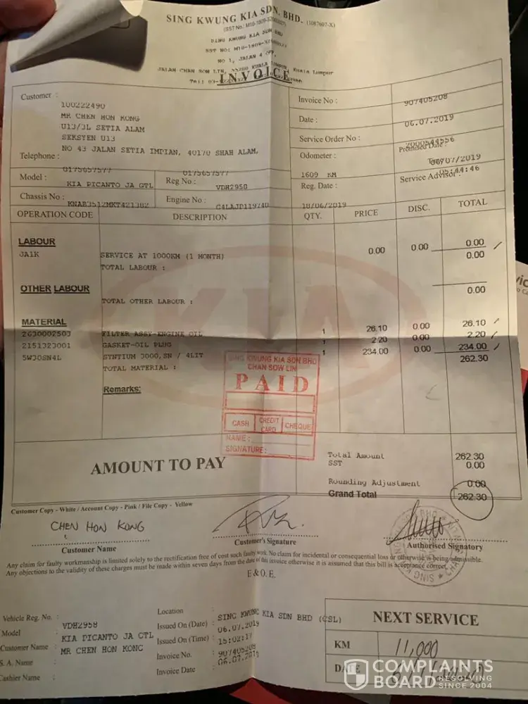 I was being informed that my new car kia picanto gtl 1000km service need to change oil and without any options i was forced to pay for oil change service which is not required for 1000km service, invoices enclosed. My car registration num is VDH 2950. Very unfriendly customer service that provide unprofessional answer on my queries why on the phone they say...