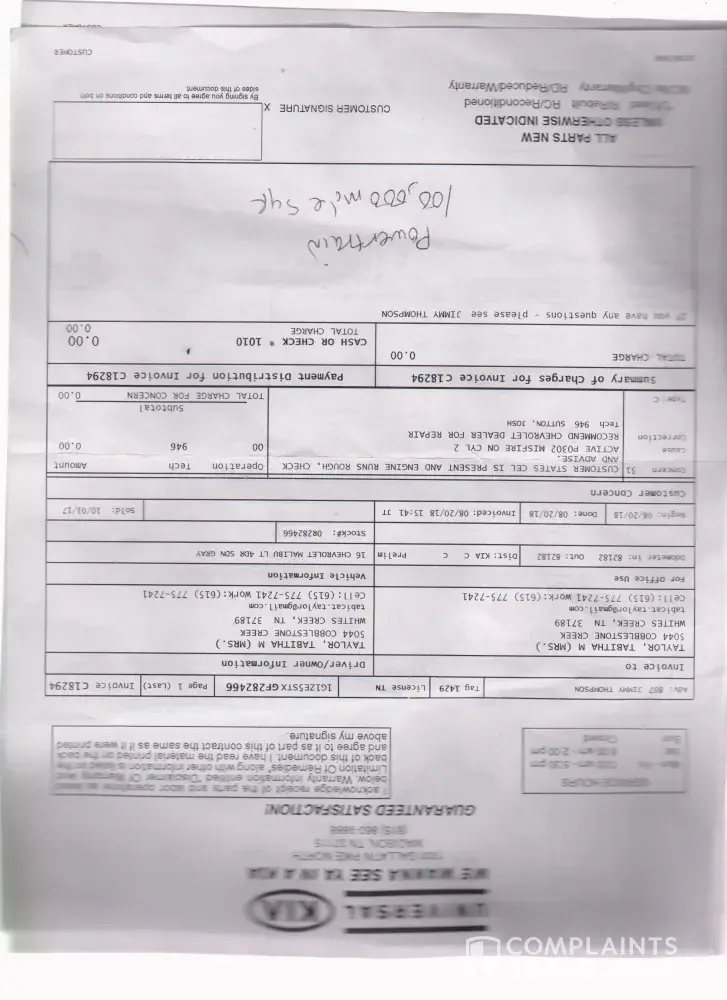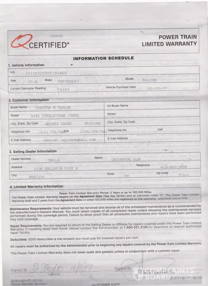 I need your help in this matter. I bought the 2016 Chevy Malibu from salesperson/David Beasley on 10/03/2017 and I purchased QCERT and Powertrain warranty in the amount of 2051.00 from Kia Madison Tn and I have been having problems out of this vehicle since day 1. I have brought the car to the Kia service dept on numerous occasions because the engine was not accelerating properly, they would never do anything about it, and told me to take the car to Serra Chevy for service and I have attached the documents for further review. I am currently without a car and I feel that I should be entitled to a rent a car so that I can go to work, I am a Cpht and my job is in demand. My car is currently at Kia and I need my car fixed or either traded for another vehicle, I have not had the car but only 11months and my warranty should be granted up until 100, 000 miles 24/months. As you can see there are 2 different diagnostic codes and Kia dropped the ball on Aug 7, 2018 when I kept telling them the car is not accelerating. I can be contacted at [protected]. Thanks for looking into this matter. I am currently working with Russ in the Kia service dept rivergate.