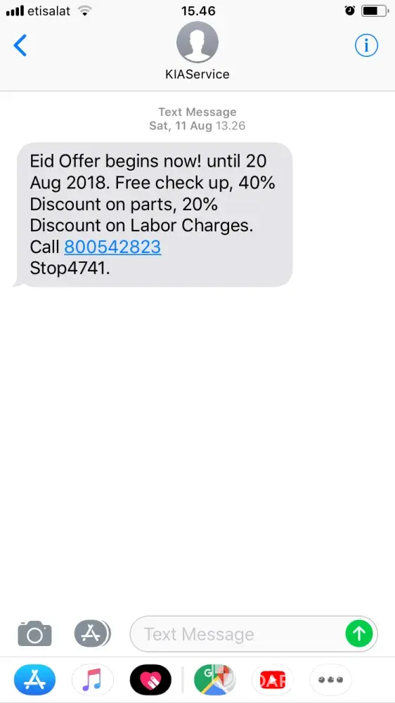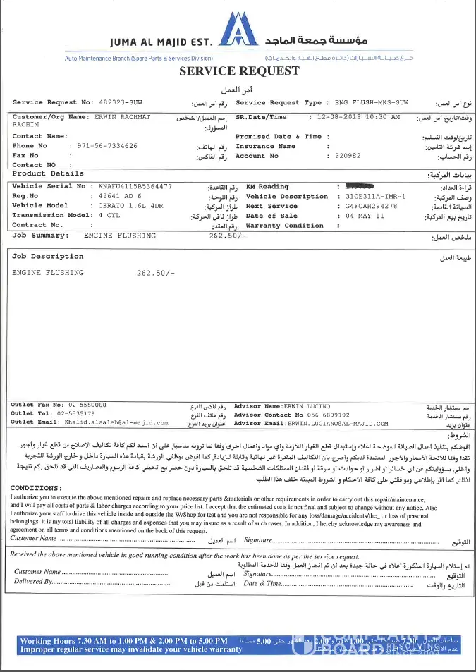 I would like to express my disappointment from your unsatisfactory service. I received an "Eid Al Adha offer" thru text from KIA Service of free check up, discount on parts and labor. I gave my 2011 KIA Cerato for service on 18 Aug 2018 and being informed by an agent named Erwin that the labor will cost around AED600 but came to my surprise I had to pay double when collecting the car however I was not discussed for the additional charges for additional services (around AED1, 300 and total amount AED2, 598.50 including parts)