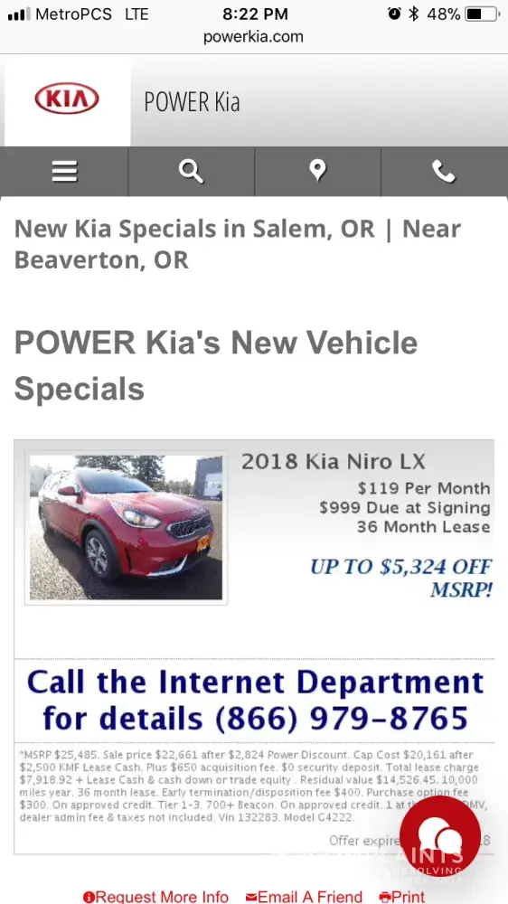 Hi, I was looking for lease car option and found online advertisement about Kia Niro 2018 car with $999 down payment and $119/- per month for 36 months lease on PowerKia.com. I visited the store in person on 2/13, took the test drive and liked to car. After arranging all my finance stuff, I setup time by calling sales person and visited the store on 2/16...