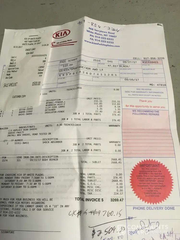 Took my car for repairs to Kia of White Plains, NY on Sept 5th, 2017