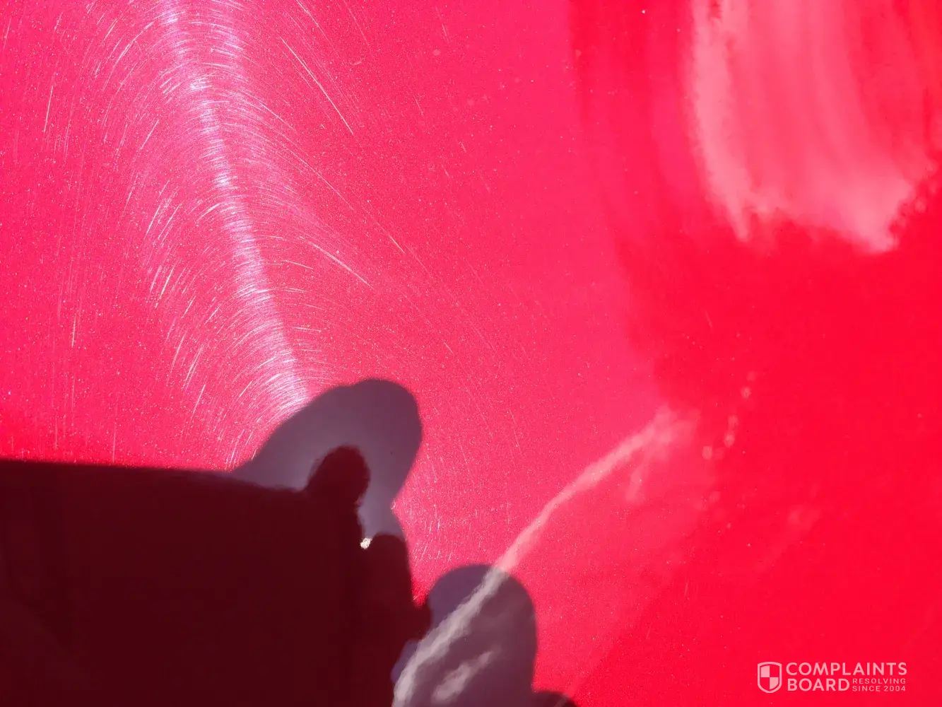The paint finish on the new car is not acceptable as a new car. Their are minor scratches all over the body. Their are large sweeping buffing marks which are white/ silver in the sun. The bonnet has 3 jorge stain marks which a painter said was the clear coat fallen on too thick and then tried to polish out. The car was sent to a car painter by the dealer and now it is in far worse condition. I have paid for a completely new car and I have not got this. After owing it for a month it should no be going to and fro to the painters kias qa has slipped up badly. Which I am very surprised at.