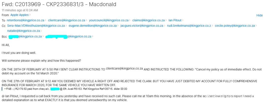 I am however starting to approach all your social media platforms to share my story and share some of the latest stats on King Price and the complaints against you from Ombudsman and others. 2018/2019