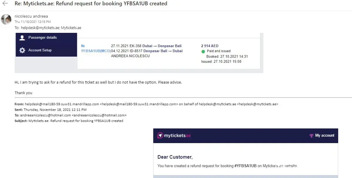 I still have a ticket of 2900 AED in my account which they wont allow me to process for refund. I have sent many emails requesting them to allow me to request the refund. I showed them the screenshots and the fact that I do not have the option. Now they went on silent. The flights are due on 26th and 27 November and I am asking them repeatedly to do something about it.