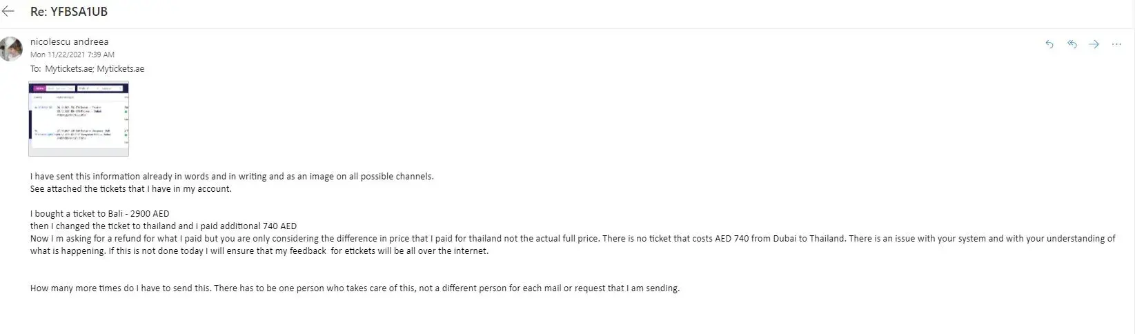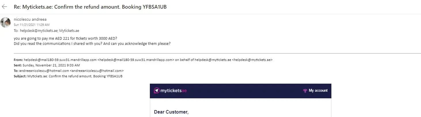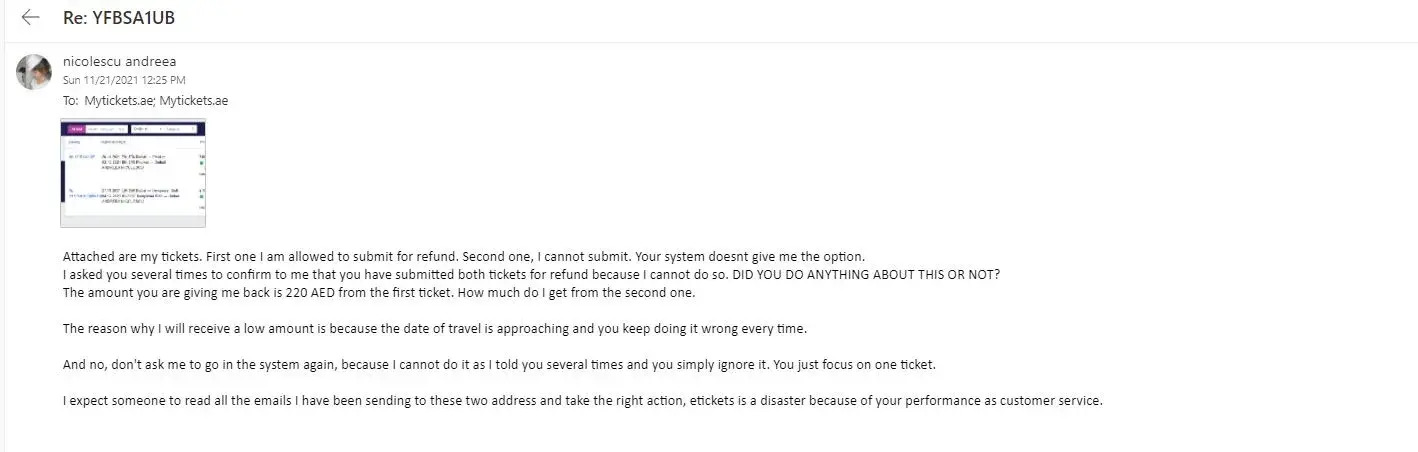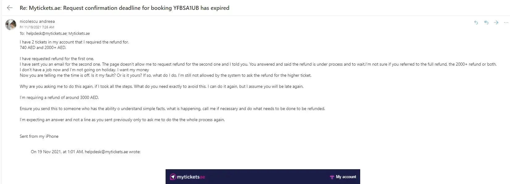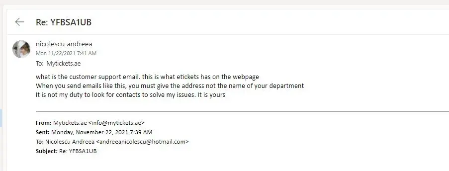 Now I m reading all the complaints about mytickets.ae. One thing I can't understand how this people still in the market. No one take action against them. Mostly they are active in dubai. How can this happen till now. How can no body ask or verify this company. Not even Google. Who advertise them. In my opinion the Google company is with them. They are partner like. Coz Google is the one who advertise this website. Mytickets.ae is on our search engines. Google also take money from them. For advertising there scam.
