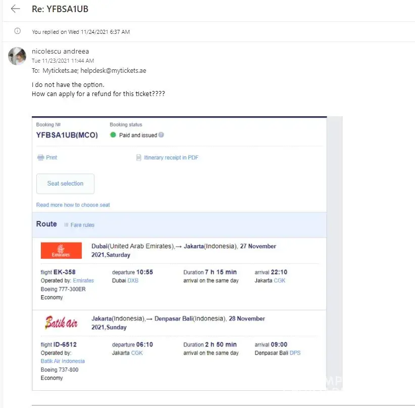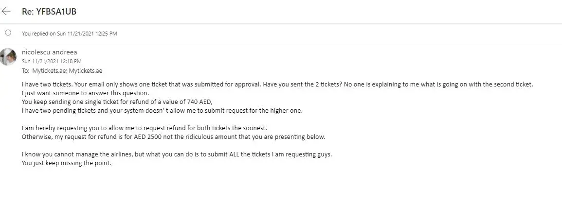 Desired outcome: I want to receive the refund of my tickets since the first day I have applied for it not now, now its too late.