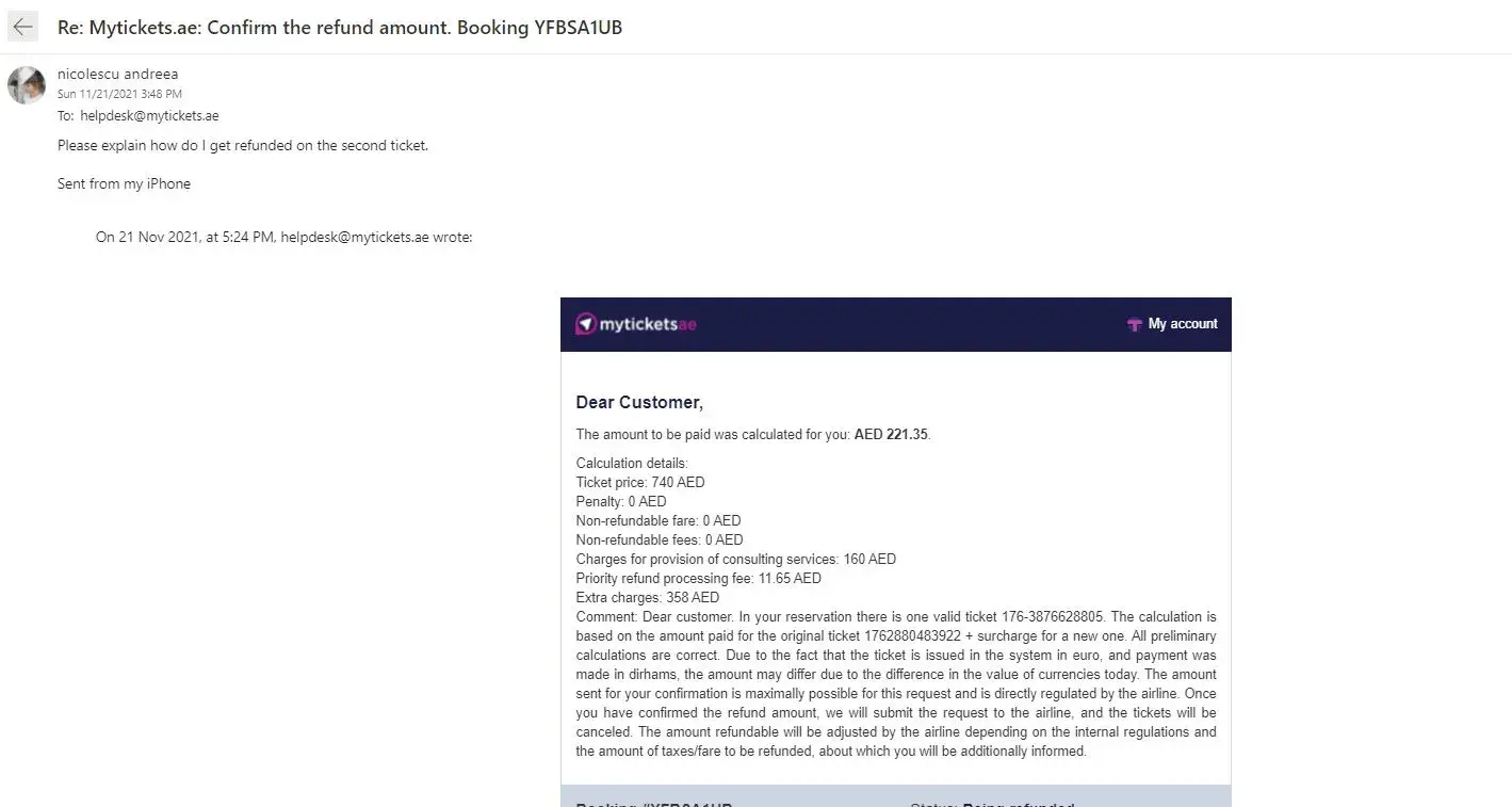 I have paid AED3,610 for my ticket but when I requested for a refund, they sent an email that the refund will be AED851, later again I received an email that it will be AED451, but later again, I received an email that it will be AED221.