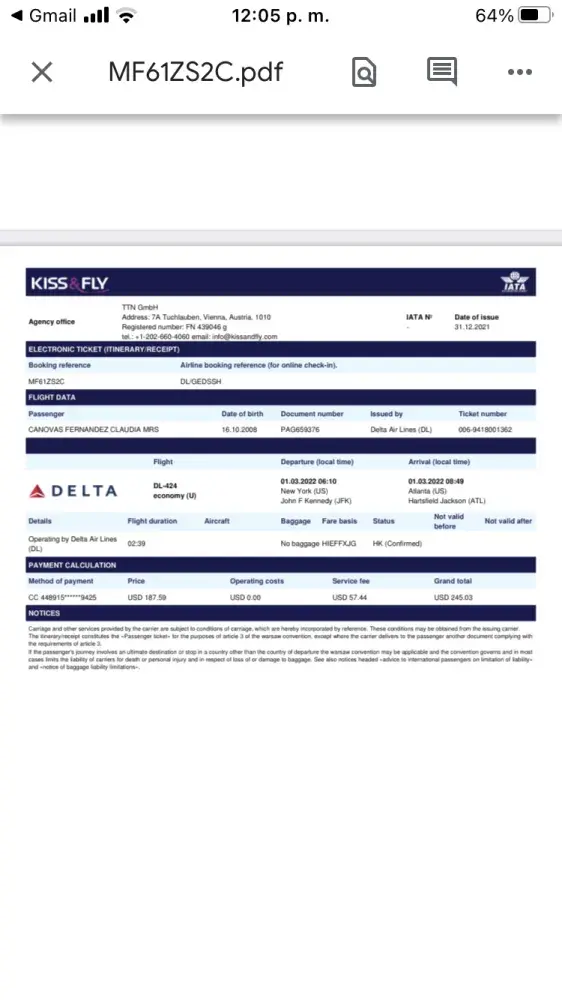Desired outcome: Economic compensation for the 5 New York-Atlanta flights and the 5 COVID Tests