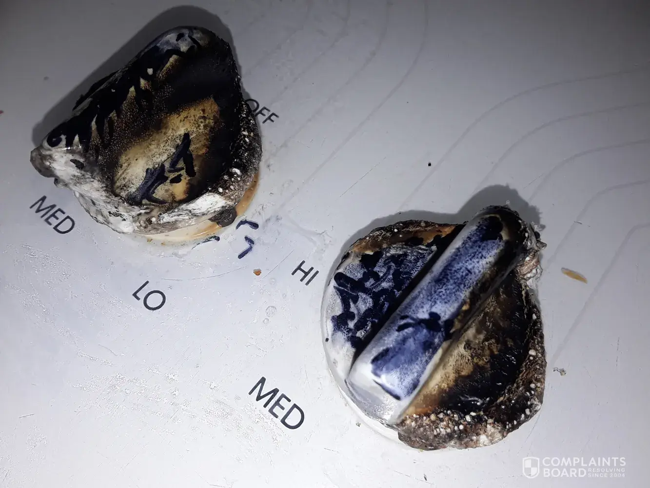 control knobs which are fused in place and cannot be removed or rotated. Additionally, there is fire damage to the overlying cabinets.