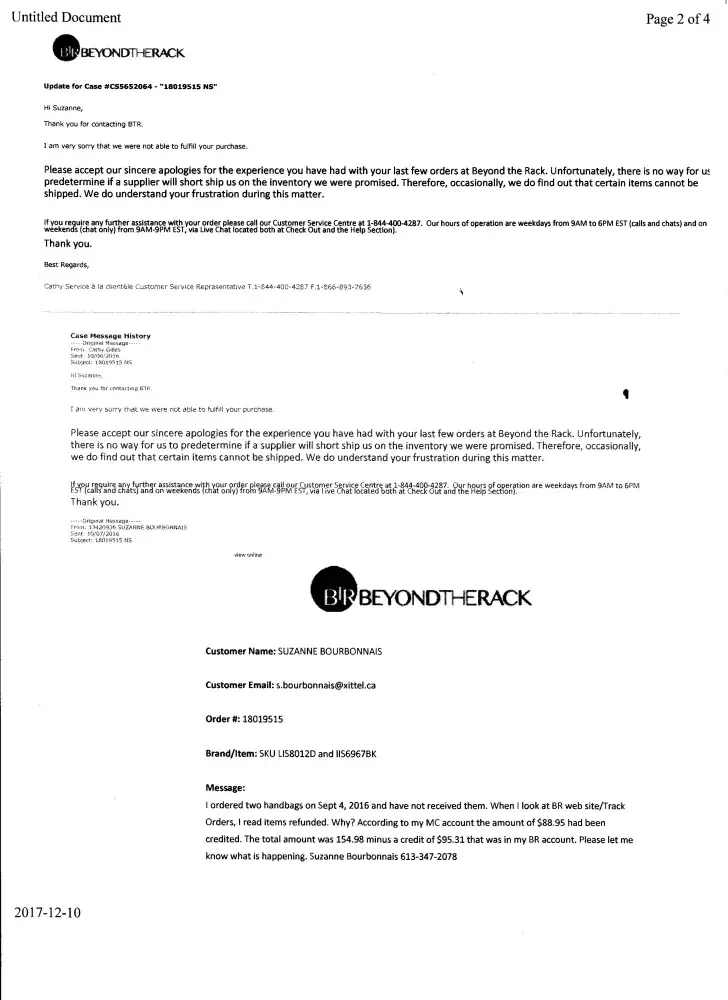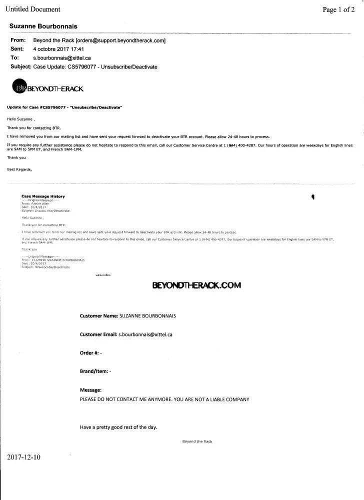 I am receiving numerous unsolicited promotional ads from Beyond the Rack even after I sent a last request on October 4, 2017 to not bother sending me promotional ads anymore. (Please see Case_CS576077, _Unsubscribe and Unsubscribe_page_1) I have good reasons to not want to deal with BTR anymore. They owe me money. (Please see Case_CS5652064_[protected]_Prefile_missing_credit)