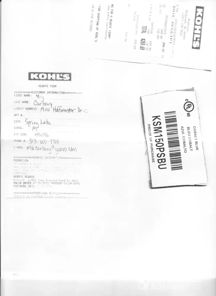 I, like others, bought a mixer with $50 rebate. I sent in the form, a cutout of the UPC showing product I bought and mailed it in. They let me know weeks later I needed to cut more of the UPC piece - not just the bar code and UPC code. The item was a wedding gift and I doubt the recipient has the outer box any more - what a scam. I spoke with a manager and said obviously I did as told and bought the item - they had the cardboard cutout of the model and I had provided the register receipt and form as needed, proving I did buy it in the date. But their scam is that they find a reason, no matter how small, to deny the rebate and then you don't get the rebate and there is little recourse. Don't buy KitchenAide - they are not a reputable company!