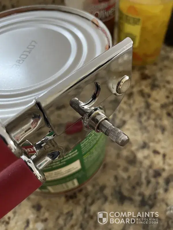 I purchased this manual can opener about two months ago to replace a rather old opener I had. While using this 'new' opener on a large tomato sauce can, the handle made a pop and now just spins around. I had to clamp a small ViceGrip pliers to the shaft to finish opening the can. As a forty plus years as a mechanical design engineer, I can see the small size splines on the shaft and the thin wall of the plastic handle are woefully undersized for this application. I am guessing this was made in China. If so, the original design might have been done in the USA and then sent abroad for manufacture, but was cut back to save a penny or two. Also I doubt any strength testing was done.