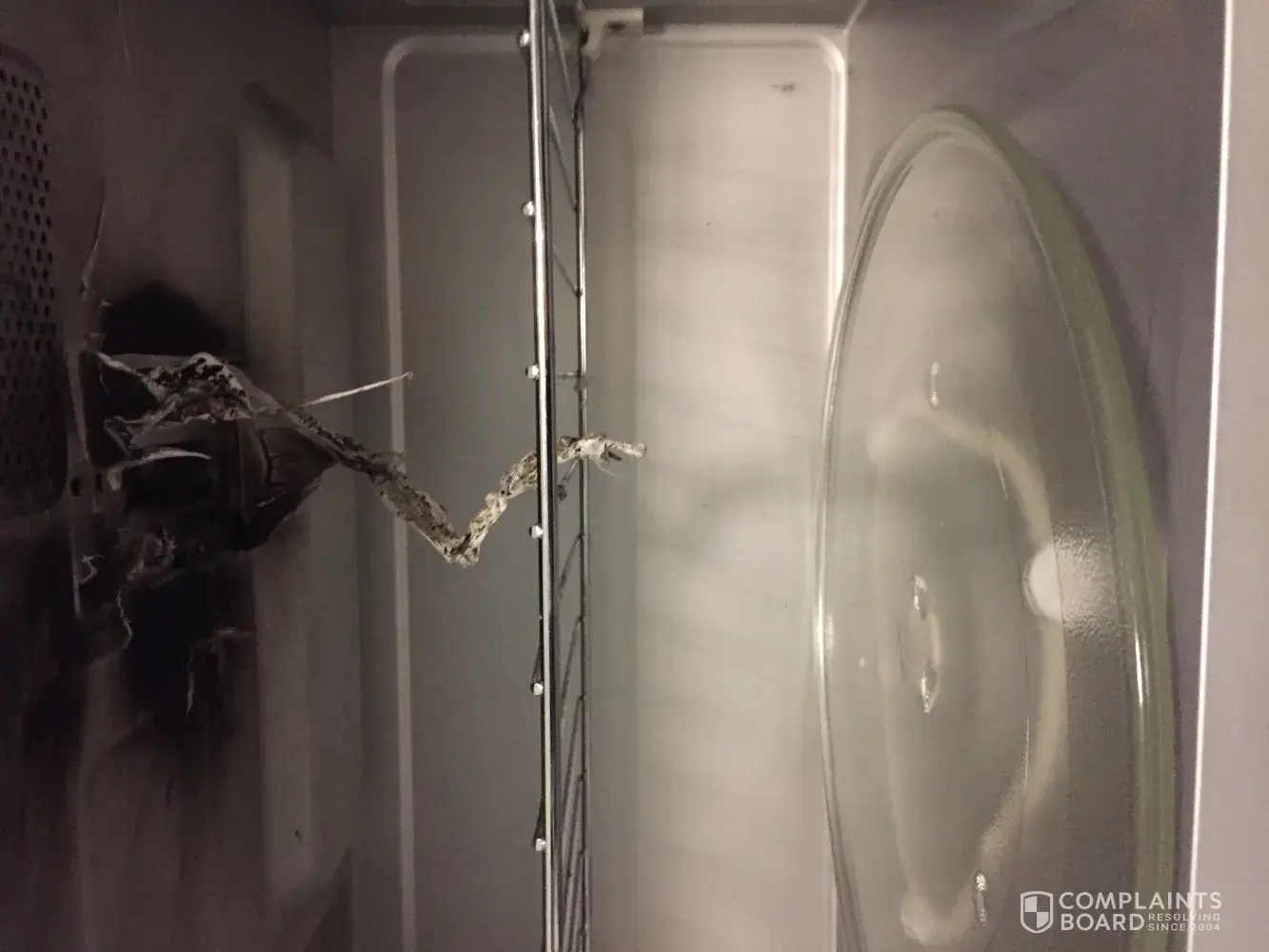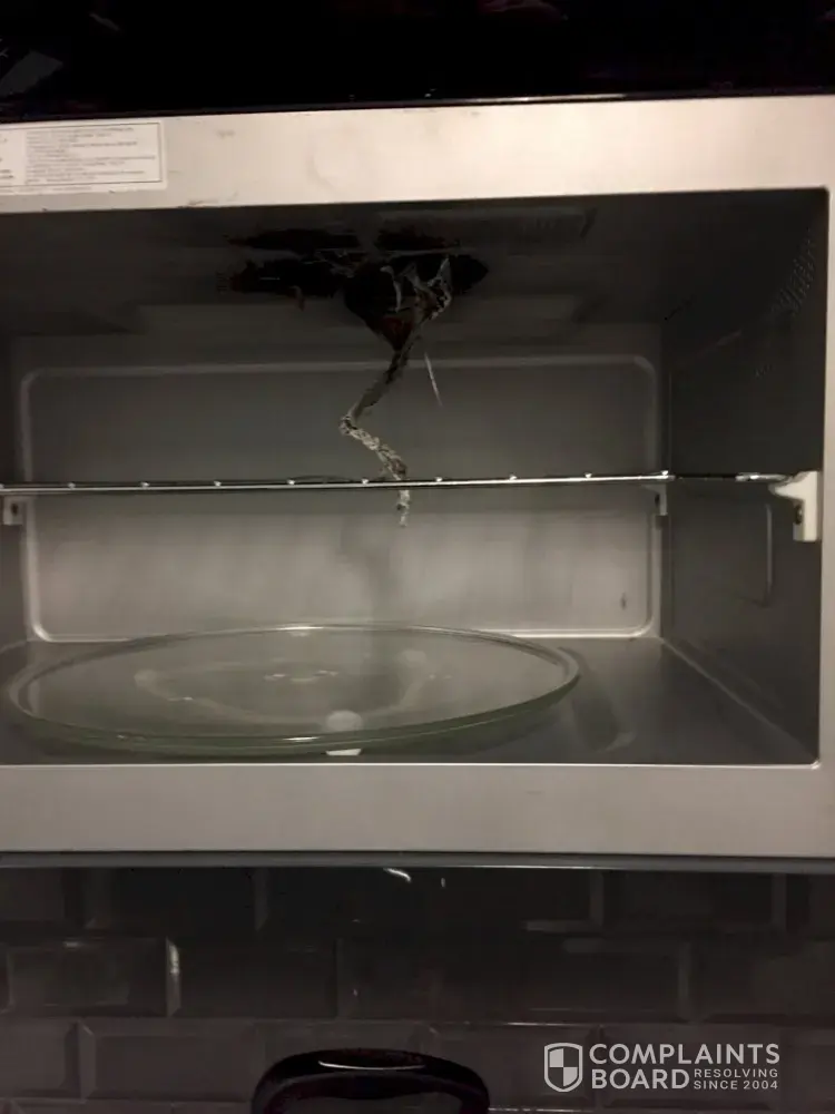 If you stand by your microwave product it should be repaced or costs replace photo of inside microwave ,top exploaded and fire