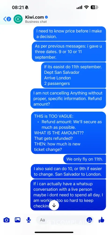 Worst travel company I've ever dealt with. I booked through them not realizing the error of my ways. They wanted to charge me 30 euros just to add a carry on bag to my flight, plus the costs from the actual airline. The 30 euros were literally for nothing. Same with picking a seat. I had to pay the airline fees plus the 30 euros from Kiwi. I decided to cancel my flight as it was within the 24 hour window that is protected by law. The airline willingly canceled the flight but *** said they wouldn't refund my money. They were only willing to give me $10 back, even though the airline refunded the entire cost. Kiwi is literally the worst travel company on earth. Do not use them under any circumstances. Learn from my mistakes