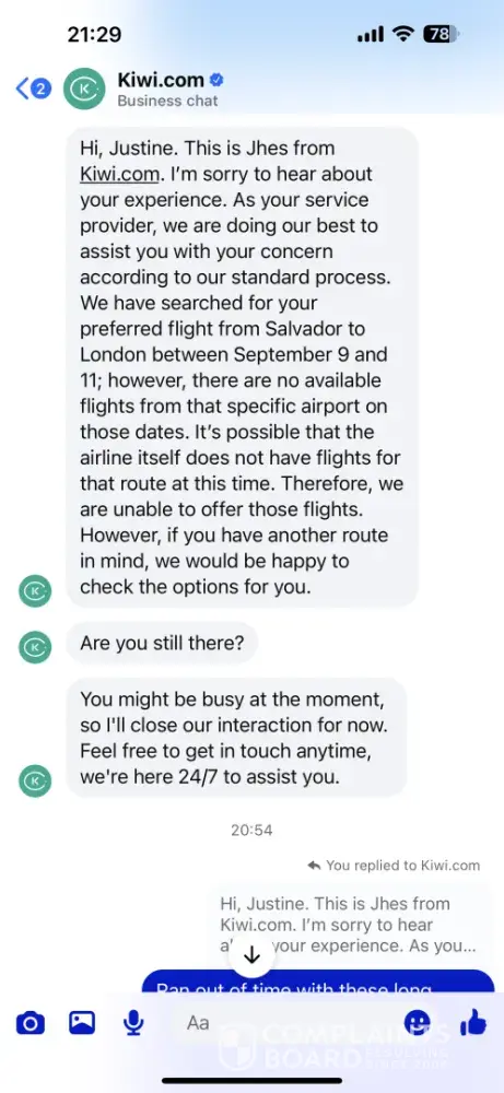 Kiwi.com Missed connecting flight and no response from KIWI.com