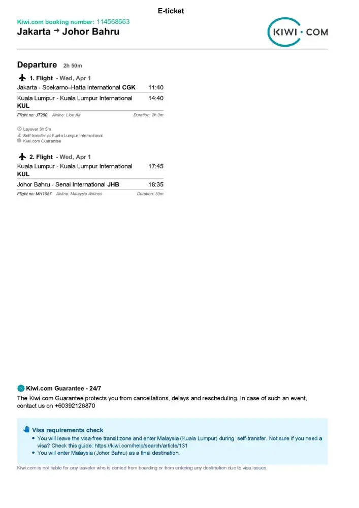 2. Trying to get a confirmation about my cancellation was so tedious. No one picked up my call, and your email support is only accessible to VIP not to all customers. So there I was, left stranded at the CGK airport. Missing my connecting flight from KUL-JHB as well, with no way of contacting Kiwi.com. (They try not to or wont pick up calls that are past 24-72 hours from the time of departure)