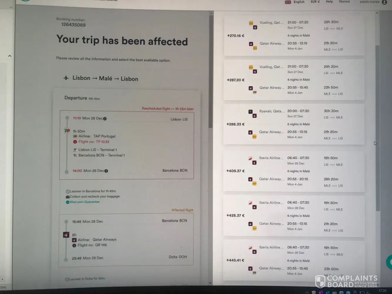 In view of the pressure that kiwi put me on, I returned to the options email and tried to confirm the tap alternative, but it was not active as an option, … I had to choose an alternative with iberia because it was the only one that approached the initial route, to I had to pay more 428, €