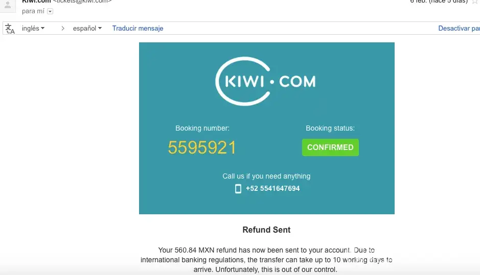 I made a one way reservation on kiwi.com that costed me about 400E and they charged me 9863 MXP (Mexican currency converted) that included 1 mexican (interjet) airline and 2 norweigan (norweigan) airlines, at the moment of buying the way back I started to have second taughts about the trip because the price got rised after a couple of days, so I decided to explore the cancelation procces that kiwi.com showed me it would be of 932 minus 20 E of penalties (this 20 where explicitly in E) and a total of 470 without explicitly indicating the currency. Not expecting that the worst case scenario in those numbers was going to be the real one because it was not sowing explicitly the currency, I decided to cancel my reservation, what a surprise that I had received a first email telling me that my reservation was "cancelled" and a refund of 0 MXP was in a process of being paid.in the mean time, one day after, another email arrived saying I would be refunded 560.84 MXP.