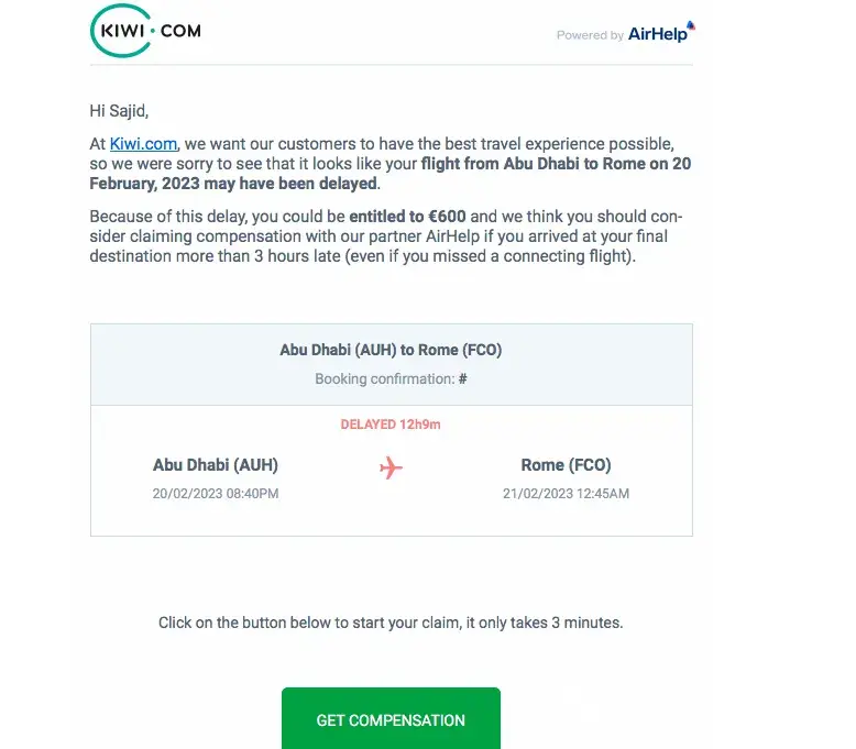 Booking reference: [protected]. Flight delay compensation from Kiwi.com