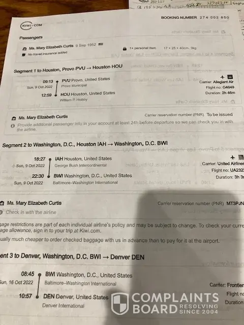 In early September I booked a round trip for my wife, paid for it and got confirmation numbers for the flights. Then everything fell apart. They claim the date of birth was wrong. They claimed they could not get tickets, they claimed there were glitches in the system. I tried, 10 times, to get help. Most of the time the people who attempted to help could barely read the interary, let alone speak coherent English. After the 8th different agent, I was told I would have to pay more fees for them to fix there problems. After 10 agents trying unsuccessfully to do anything about all the problems with the booking, I gave up. I just figure the company is little more that a site to steal money from unsuspecting would be travelers. DO NOT USE THEM. TAKE YOUR MONEY AND FLUSH IT DOWN THE TOILET INSTEAD OF GIVING IT TO KIWI.COM. Dates of injury 9-5 to 30-2022.