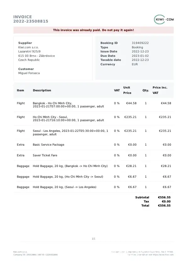 On December 23rd 2022, I purchased three independent tickets from Kiwi.com (as described in the attached invoice) and I was unable to board the first of those flights.