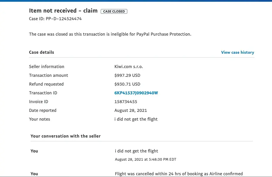 Resolution: Please help me to provide me remaining refund amount $930.71 to my PayPal account by kiwi.com
