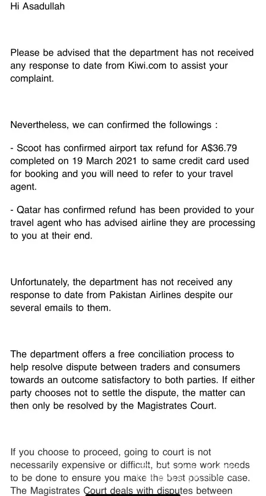 I have booked ticket on kiwi.com to Sydney from Chennai on Jan 03 2021 for amount of 158, 685 INR .since my part ticket is involves connecting flights from Dhaka, Malaysia and Indonesia. I got my flights cancelled from Jakarta Indonesia to Sydney flights.so I applied for refund on 15th Jan 2021.but till now 12.07.2021 ..the kiwi.com agent saying that the airline is not responding to refund request due to covid-19.it has been more 6 months since i have applied on 15th Jan 2021.plsease help to get my refund amount.kiwi.com is big scam for air passenger during covid-19 times. They are cheating the customer by not refunding the amount from airlines.
