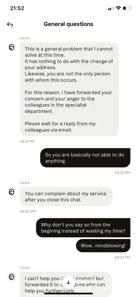 Again, back to the customer service and since then no solution. A back and forth of useless emails with no solutions whatsoever and the last communication on 16 August (so a month later) saying " Sadly theres nothing much I can do right now, since everything is wrote down correctly in Klarna. I forwarded this problem now to another team from Klarna who can look deeper into the issue, these will contact you via e-mail if they figured this out. However I dont know how long this will take, it depends how much work volume they have."