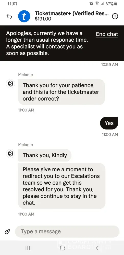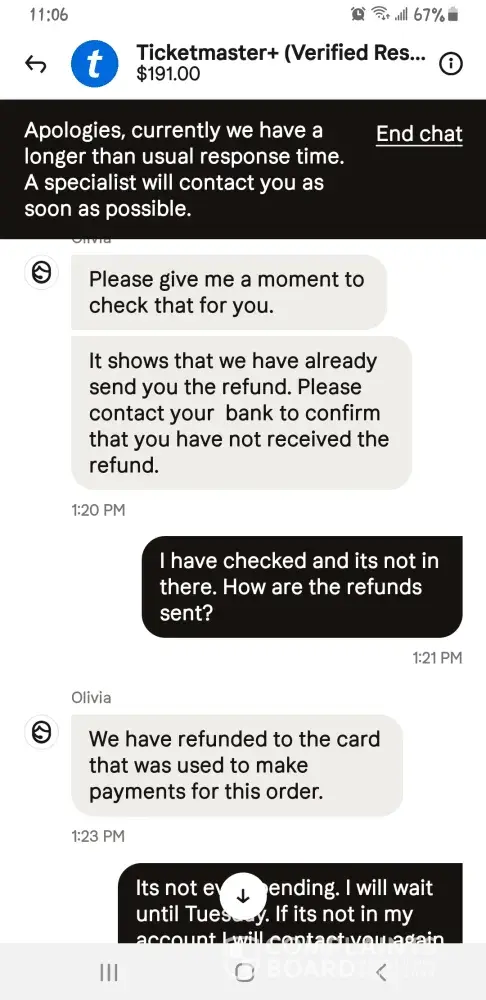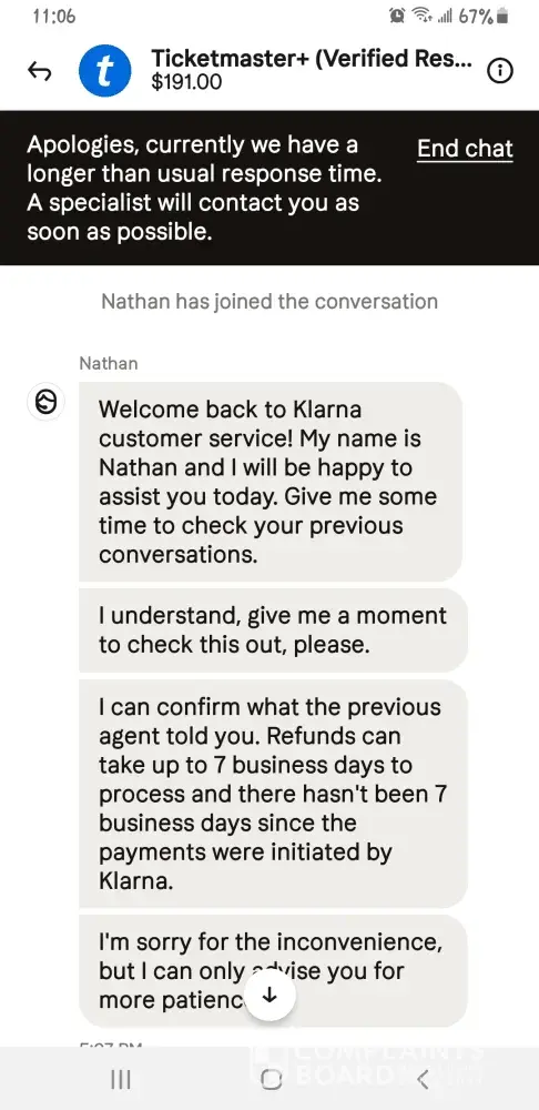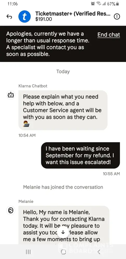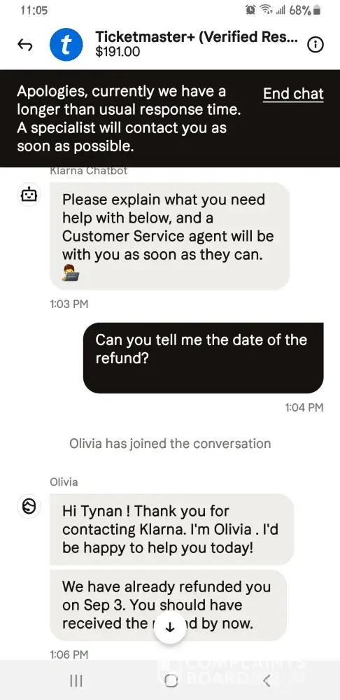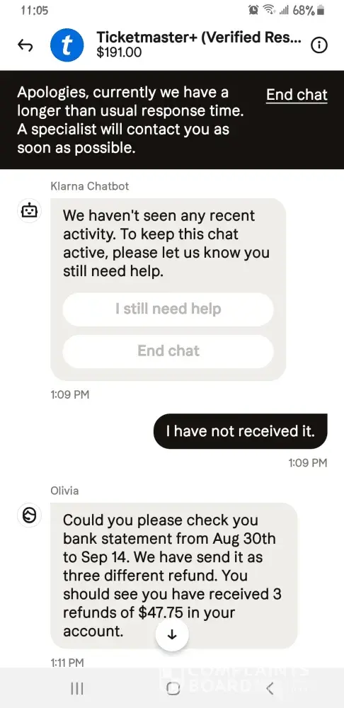 I purchased concert ticket from Ticket Master via Klarna. The concert was cancelled due to COVID19. The $191 was refunded back to Klarna. They said they refunded me on 9/3/21. Its now 12/14/21 and still no funds have been received back into my checking account. I have chatted with them 3x over the last couple weeks. Suppose to have my issue escalated to stay on the chat board for several hours and no response.