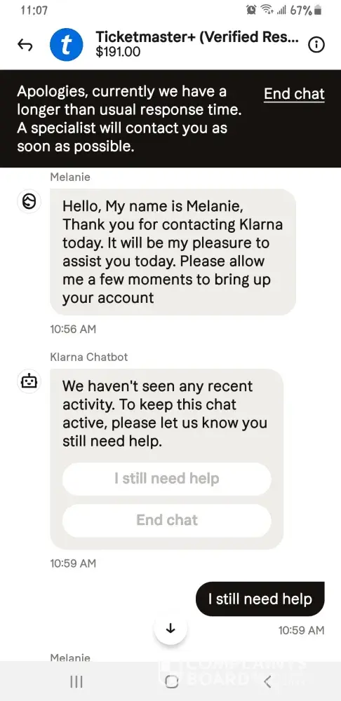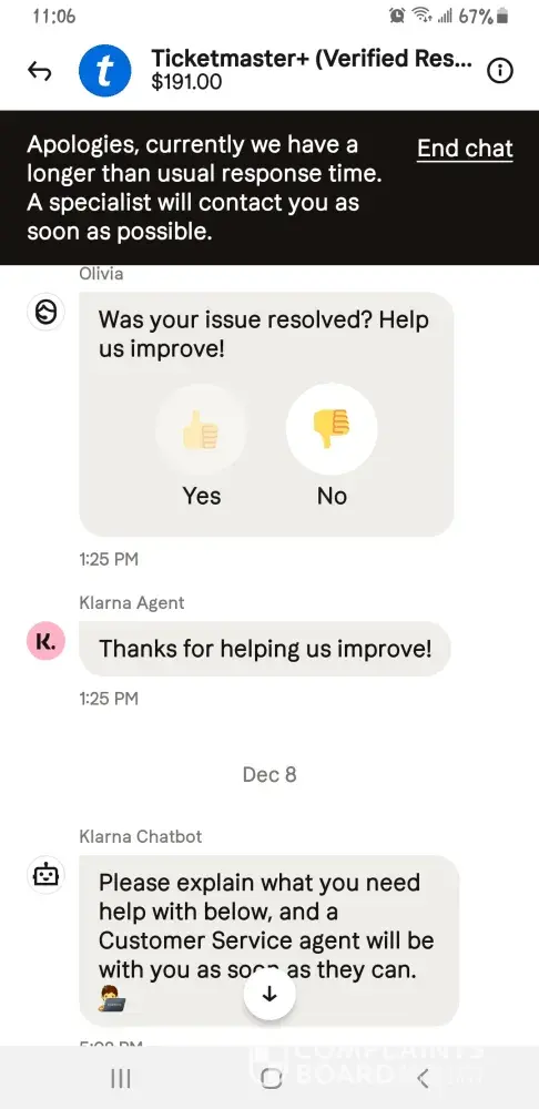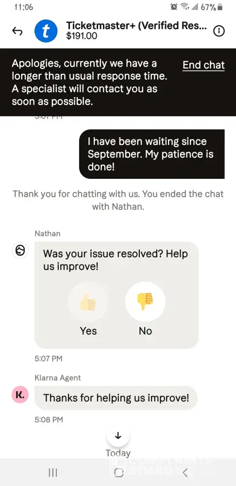 - While Klarna Bank has a high level of trust, our investigation has revealed that the company's complaint resolution process is inadequate and ineffective. As a result, only 0% of 36 complaints are resolved. The support team may have poor customer service skills, lack of training, or not be well-equipped to handle customer complaints.