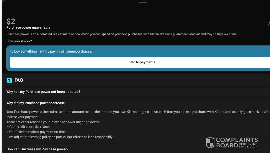 Klarna said I have $798 in buying power. I tried to make a $350 purchase on Ticketmaster using klarna and the transaction didn’t go through. I made payments early, paid off purchases early and tried lower amounts with the transactions not going through. The incidents happened on 3-11-22 and 3-10-22.