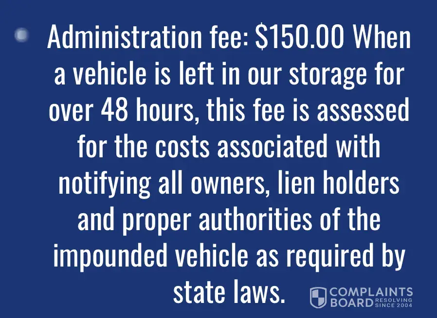 Klaus Towing advertises $150 admin fee specifically for the purpose of notifying owners, courts and others (as required by law) after vehicle has been left for 48-hours. I have been towed twice in the last six months by Klaus and the total charge for my vehicle left for 4-days was $530 and most recently $470 after 3-days and neither time was notified by mail, phone or otherwise but in actuality I reached out to them. I questioned the policy the most recent time and was told "...the fee is still applicable" which leads me to believe the lack or absence of filing not to mention the inflated price to do so.