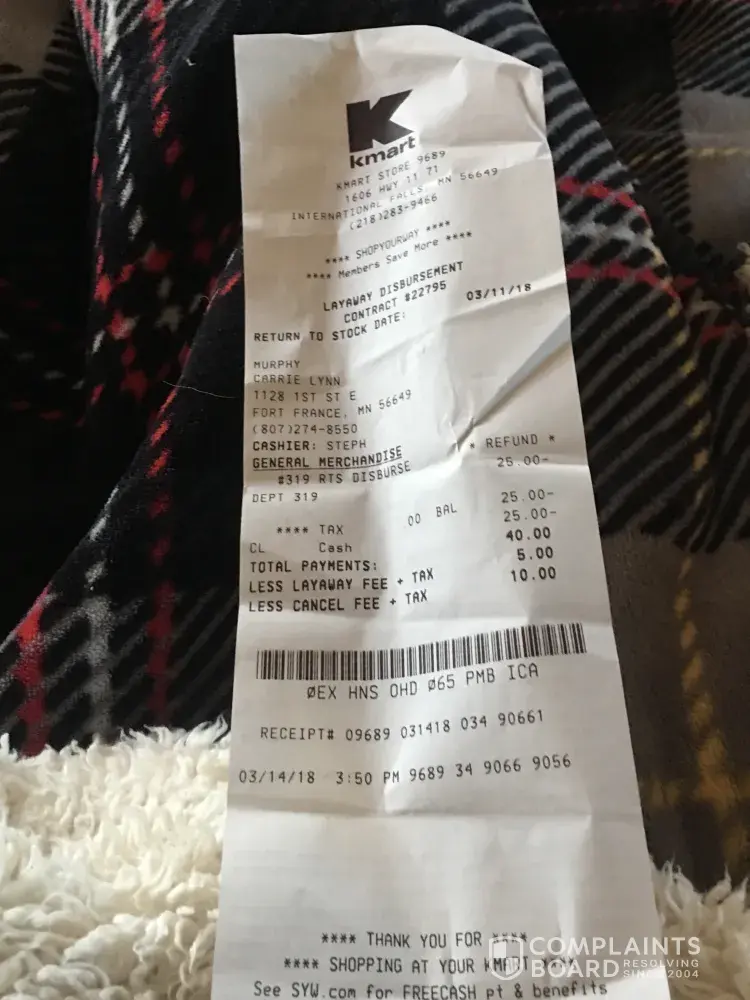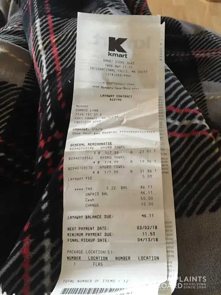 On Feb 16/18 I put towels away on layaway for my mom. I'd never done this before and the girl named Stephanie told me I had 8 weeks to pay it off. I never used the layaway service before. She failed to tell me I needed to make a payment after 2 weeks. I went across the border to pay for the towels and they put the towels back in stock and charged me 5$ layaway fee and 10$ cancellation fee. The layaway number was 22795. So I basically paid $15 for nothing. I will never ever set foot in the international falls KMart EVER AGAIN!