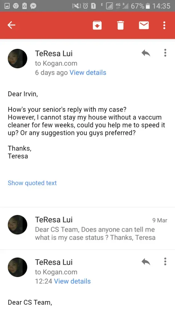 My request number is #6469639. Read my 36 emails from Kogan not including mine and you will see why I'm so annoyed.