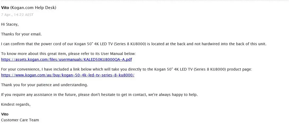 I ordered the unit and received it 12/04/2018 and found the power cable is in fact hardwired. 14/04/2018 I emailed Kogan help to express my disappointment. I gave them the serial number when prompted and was told they would contact a supervisor. I emailed again 16/04/2018 to enquire where my complaint was at to be told they were still waiting on a supervisor. I emailed again 19/04/2018 to follow up & no one replied . I emailed again 20/04/2018 to advise that I had contacted Fair Trading and am awaiting there response which will take up to 10 business days.