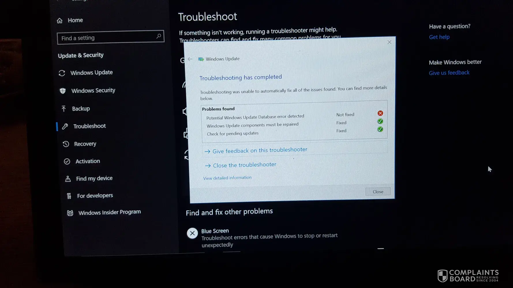 17.2.2020 I gave photo's of the "Windows Update Database Error detected' & told them that I had a Faulty Laptop.